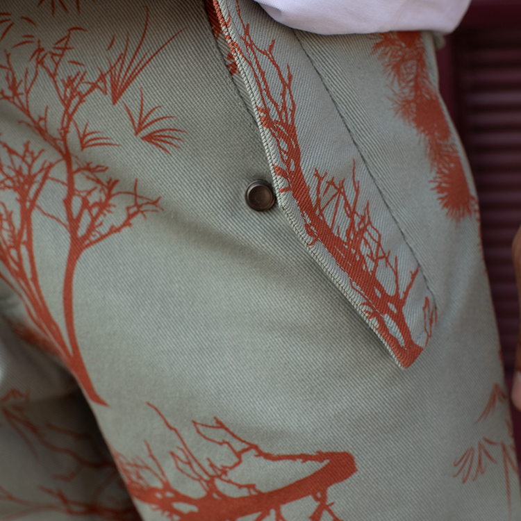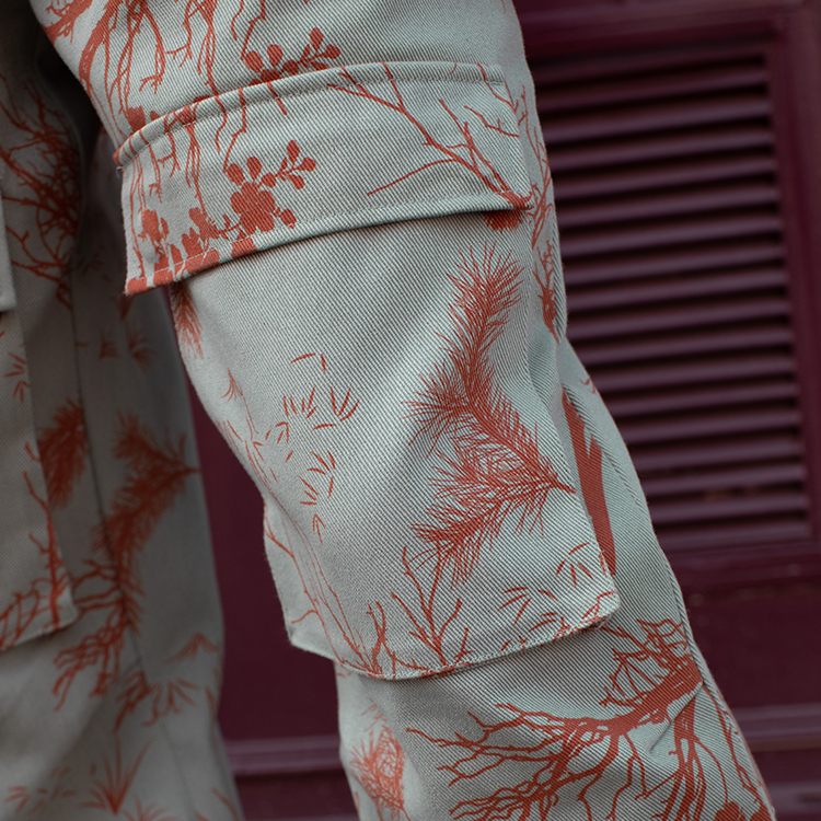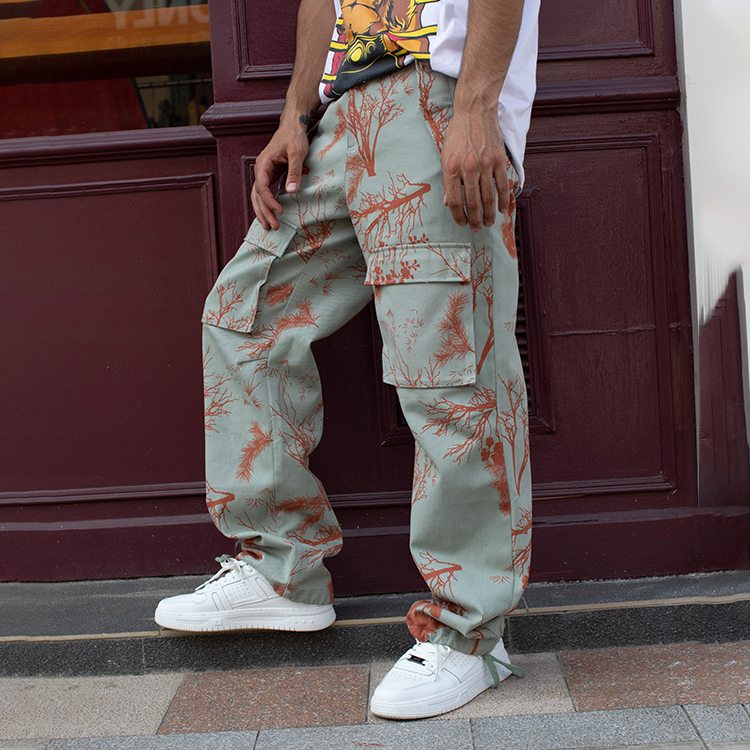 Appearance:Embrace a contemporary yet functional design with these trousers, featuring practical side pockets, paired with dual knee pockets at the front, and adorned with intricate tree branch-inspired prints. This combination of utility and thoughtful detailing not only elevates the garment’s visual appeal but also offers a touch of individuality, merging form and function seamlessly.