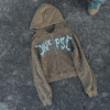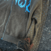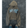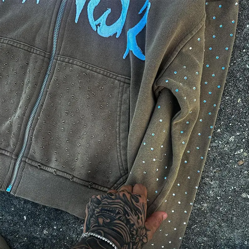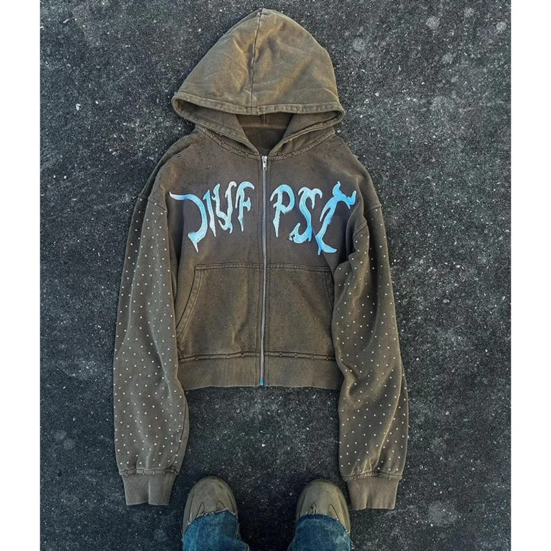 This stylish hoodie features a convenient front zipper and a cozy hood, making it both fashionable and functional. The eye-catching printed design on the chest adds a trendy touch, while the washed vintage finish lends a classic appeal. Additionally, decorative rhinestones on the sleeves bring an element of sparkle to this retro-style sweatshirt, making it a standout piece in any casual outfit.