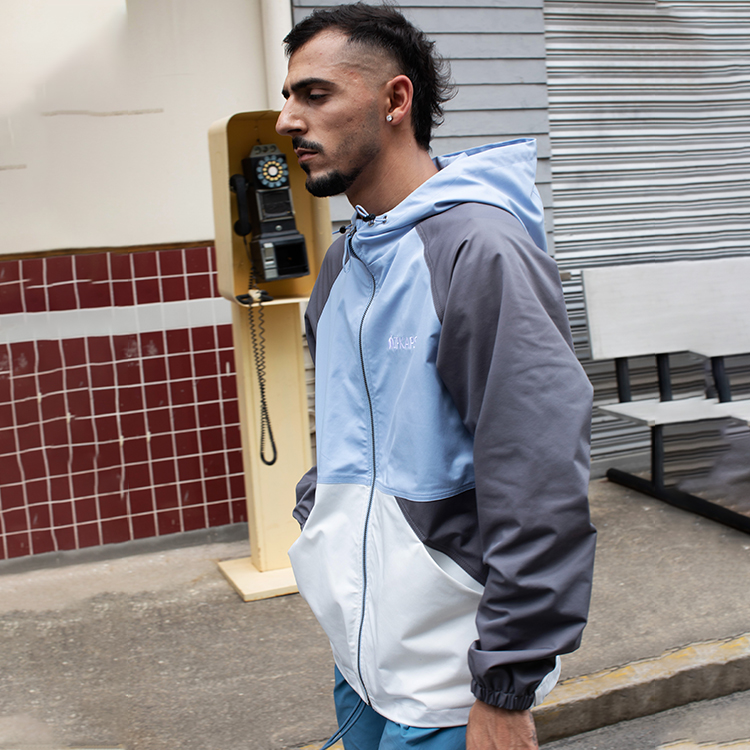 Elevate your style with its fashionable design featuring a hood and long sleeves with a color-block pattern, adding a modern and sporty flair to your wardrobe. Stand out from the crowd with this eye-catching and trendy windbreaker that seamlessly blends function and fashion.