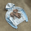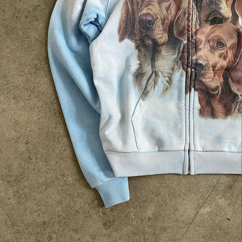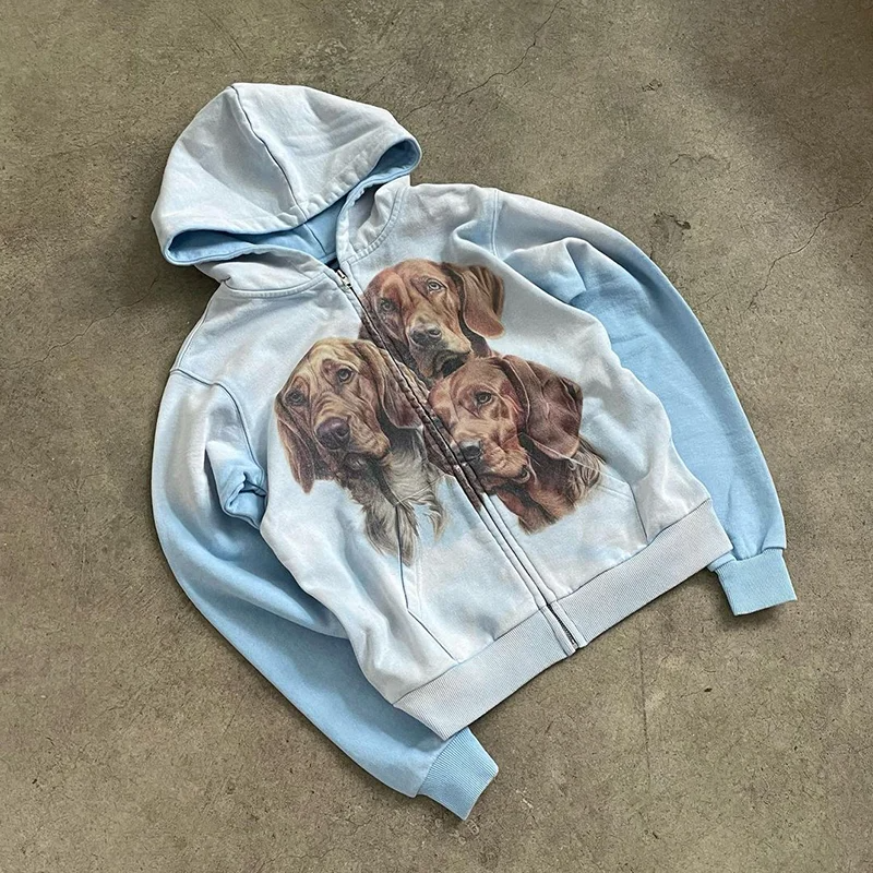 This hoodie features a functional front zipper and a cozy hood for added warmth and style. The eye-catching printed design on the chest adds a trendy touch, while the washed and distressed finish gives it a unique vintage appeal. With front pockets for storage and a retro aesthetic, this sweatshirt effortlessly combines modern fashion with classic elements, making it perfect for any casual occasion.