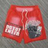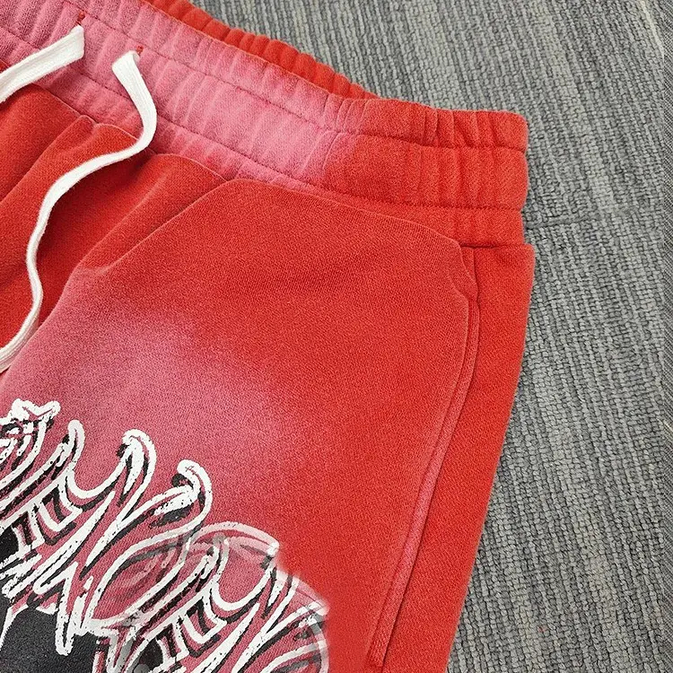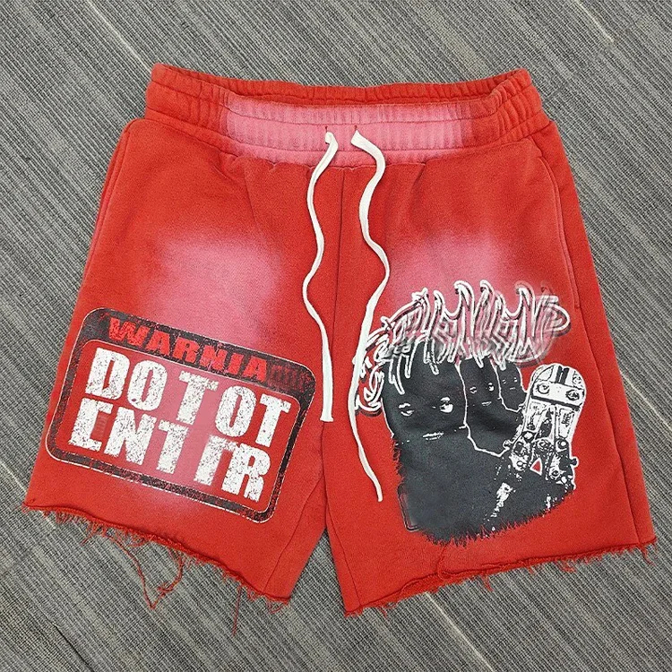 These shorts feature an elastic waistband with an adjustable drawstring, providing a customized fit that ensures all-day comfort. The design includes practical side pockets for storing essentials, while the stylish front showcases a unique graphic print that adds a trendy flair. Finished with a washed and distressed look, these shorts combine functionality with contemporary style, making them a fashion-forward choice for any casual outing.