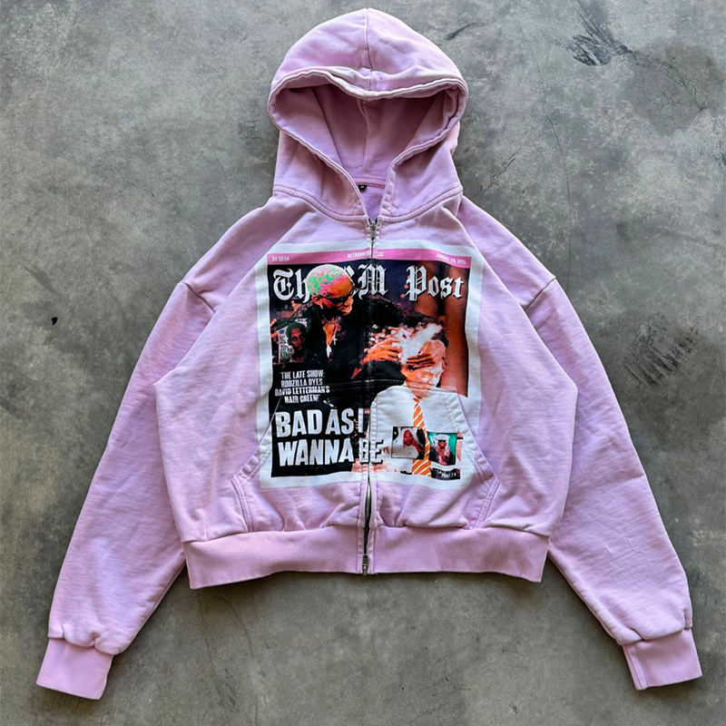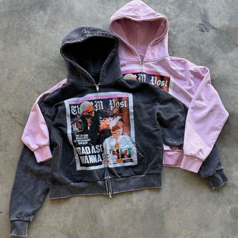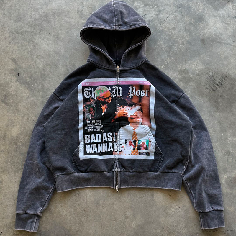 This sweatshirt features a trendy hooded design, complemented by a striking graphic print on the front and a convenient zip closure. The vintage wash adds a unique touch, elevating its retro aesthetic. This combination of classic style and modern elements makes it a versatile addition to your wardrobe. Perfect for layering, this hoodie effortlessly enhances any casual outfit while keeping you cozy and fashionable.